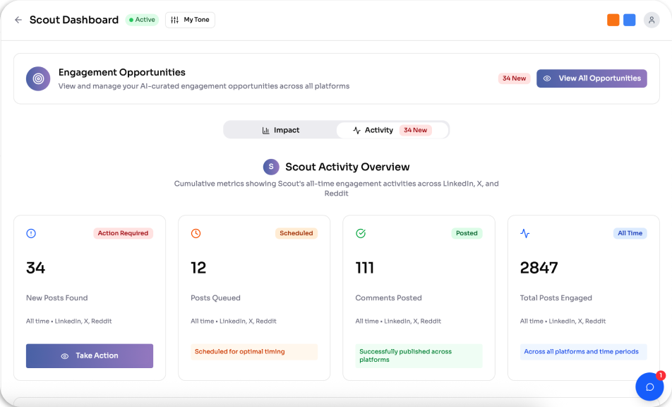 Most ads get ignored. Cold outreach feels like shouting into the void. Scout doesn’t guess. It listens. Every day, it finds real conversations on Reddit, LinkedIn, and X asking for help with problems your product already solves.